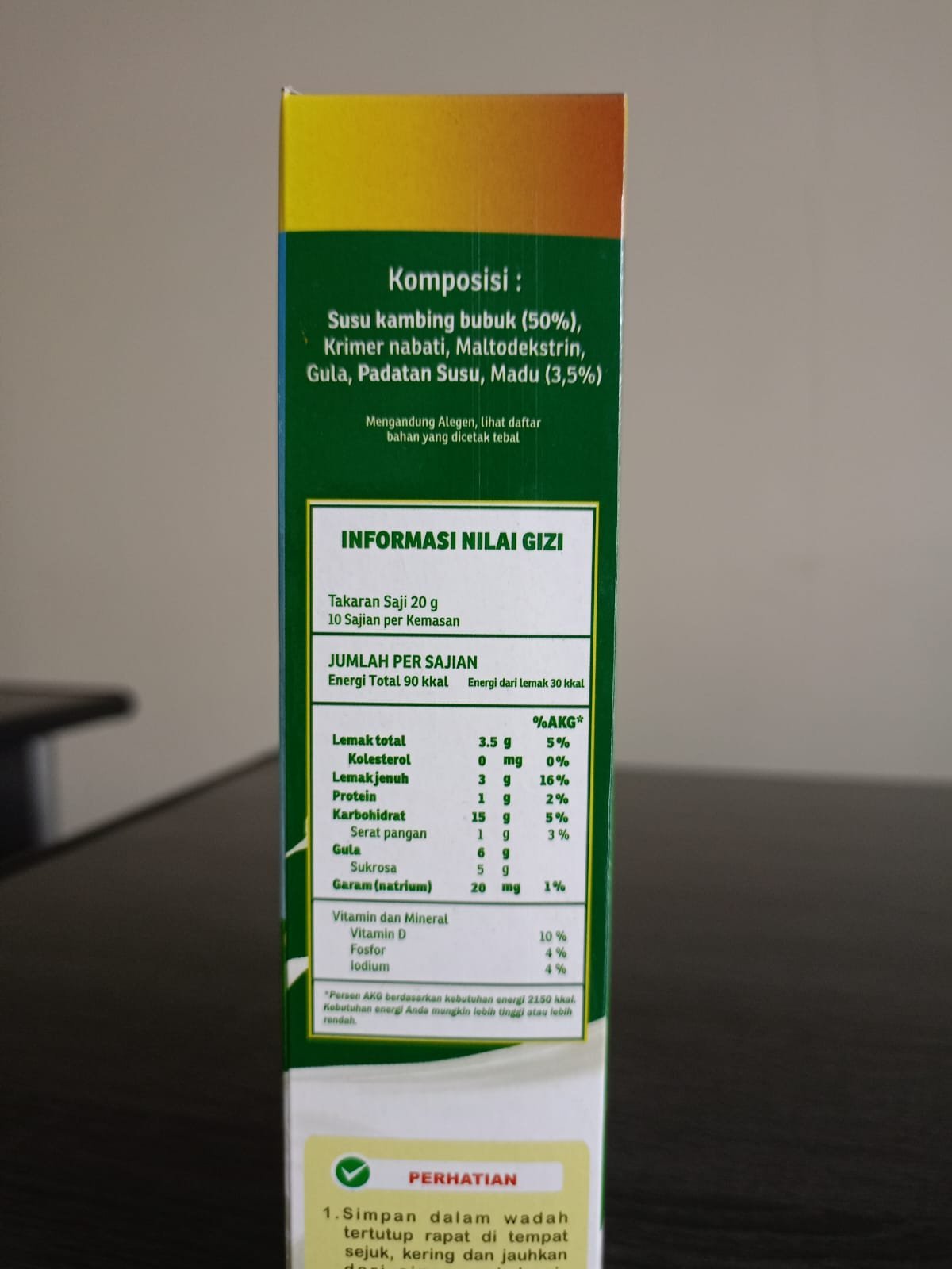 Komposisi : Susu Kambing Bubuk 50%, krimer Nabati, Maltodekstrin, Gula, Padatan Susu, Madu